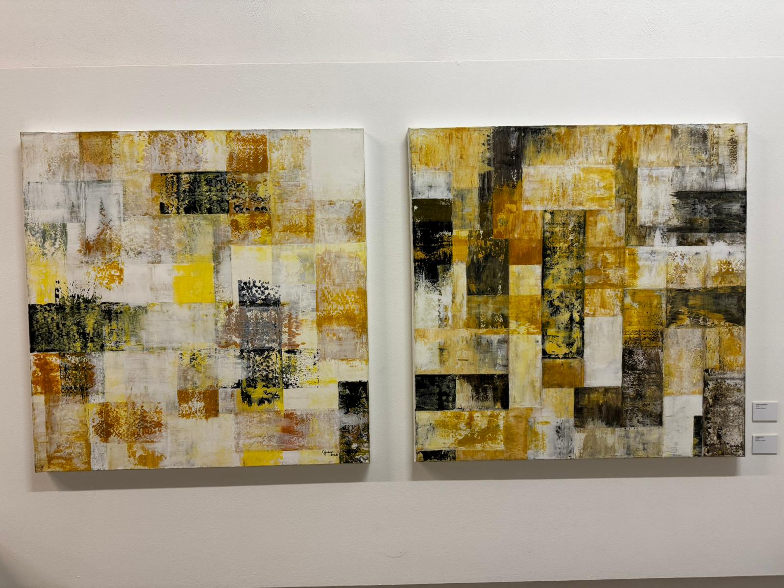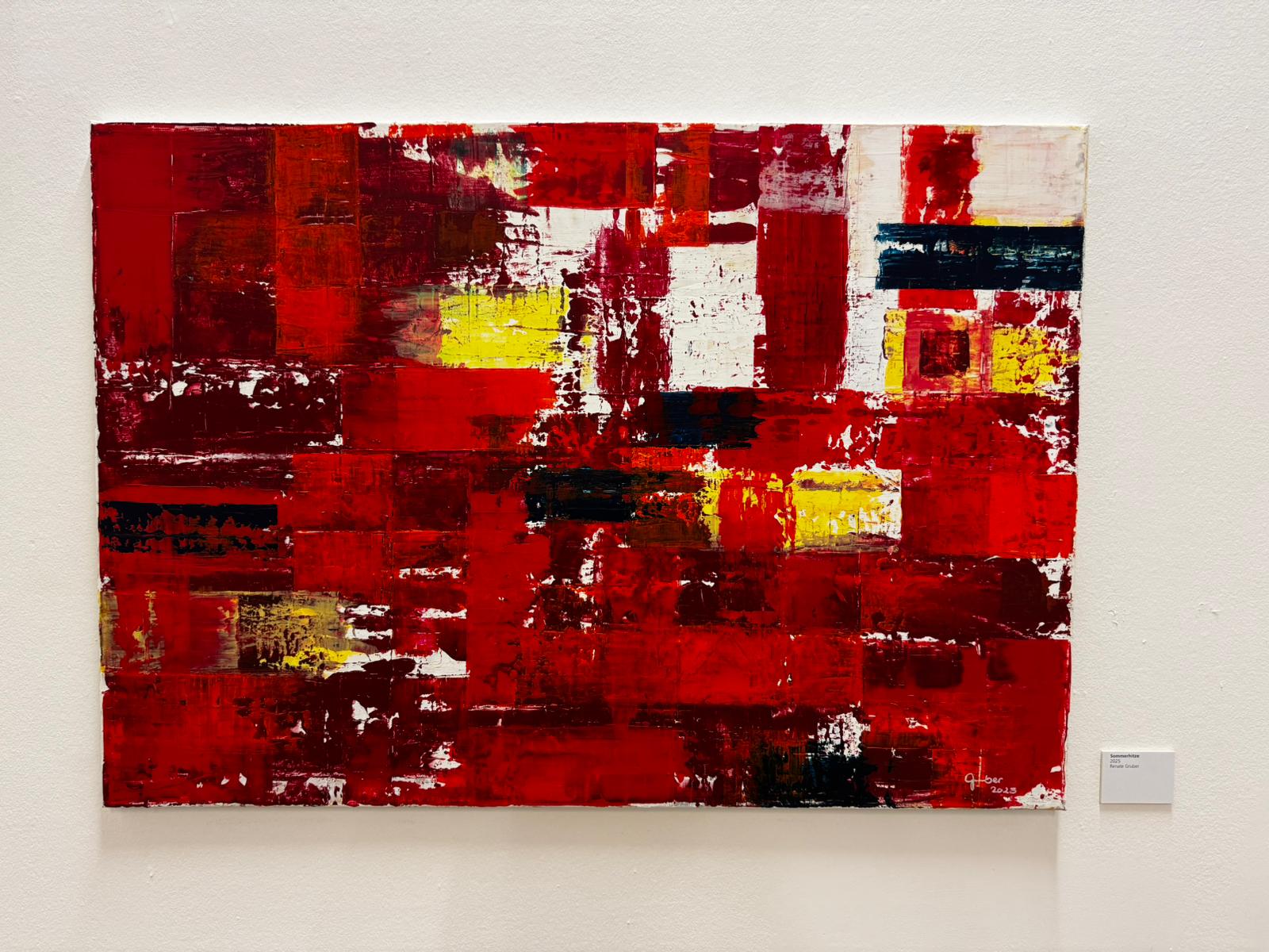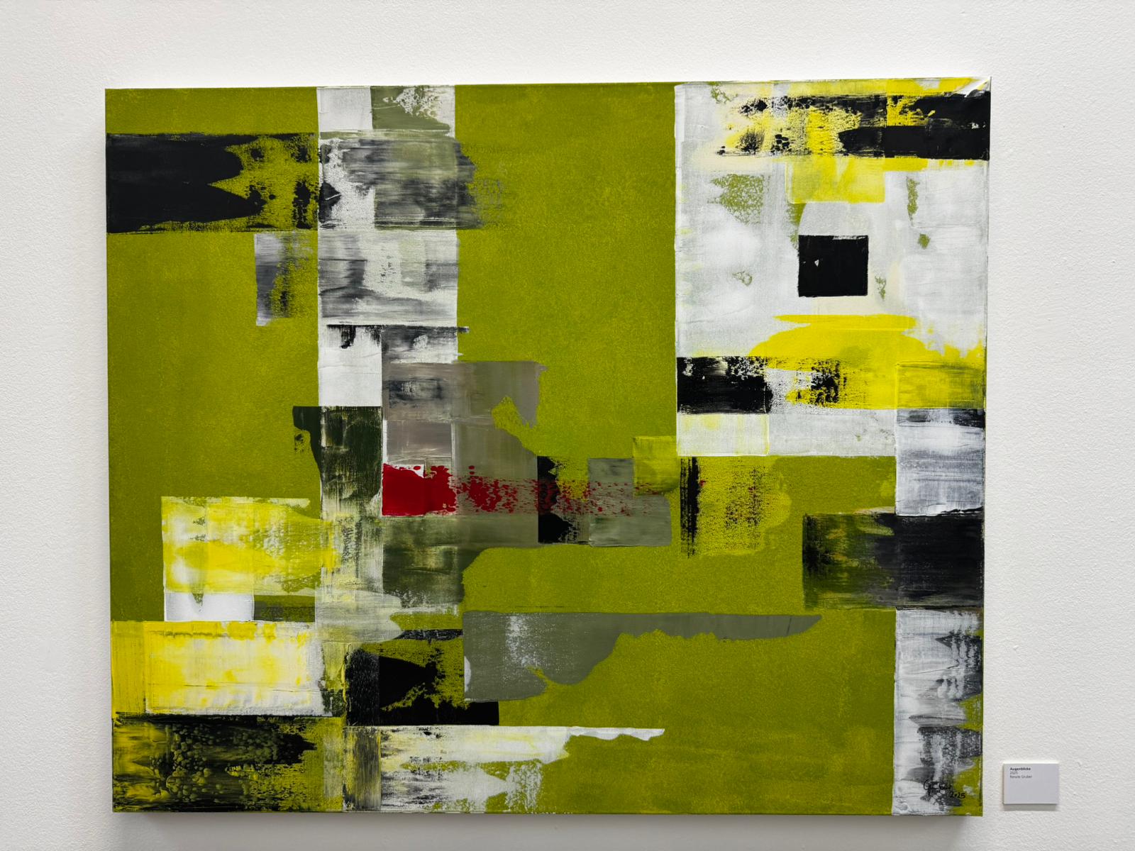 In einer zweiten Reihe löst sich die Arbeit vom Gegenständlichen: Farbige Quadrate, scheinbar frei gesetzt, verdichten sich zu dynamischen Kompositionen. Im Spannungsfeld von Ordnung und Farbe entstehen abstrakte Bildräume, die bewusst offen bleiben und zur eigenen Interpretation einladen.